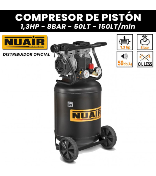 Compresor vertical silencioso 50lt 1,3HP 8 Bar Nuair