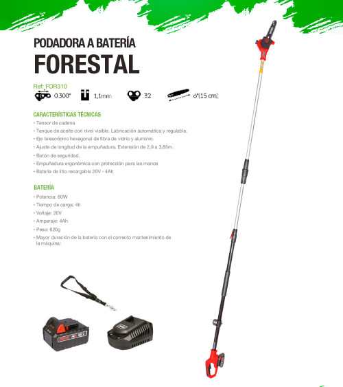 -66,10 € Vista rápida Añadir al carrito Podadora batería FORESTAL FOR310 3.85mt (incluye batería 4.0 Ah) Precio habitual 375,10 € -66,10 € Precio 309,00 € La podadora a batería Forestal FOR310 es una herramienta diseñada para facilitar la poda de ramas altas con precisión y comodidad. Equipada con una...