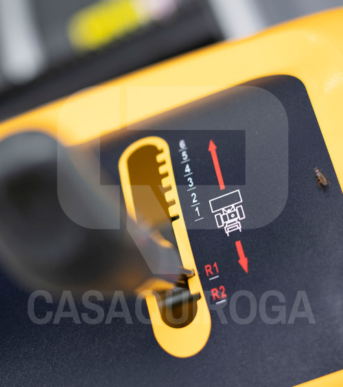 La barredora cuenta con una transmisión de disco de fricción con 8 marchas, 6 hacia adelante y 2 hacia atrás. Esto permite al operador controlar la velocidad de la máquina y adaptarla al terreno.