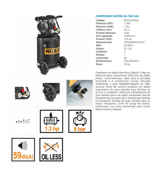 Compresor vertical silencioso 50lt 1,3HP 8 Bar Nuair