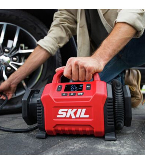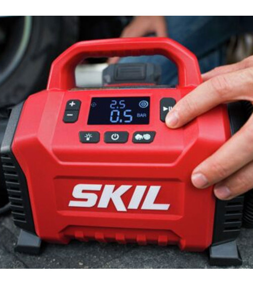Compresor de reducidas dimensiones a batería de Skil. Ideal para inflar neumáticos de coche, bicicleta, pelotas...