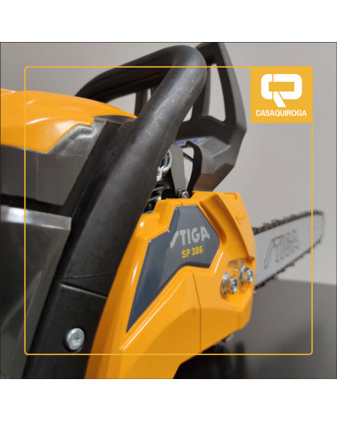El modelo SP 386 de Stiga es una motosierra a gasolina con un motor de 38,5cc y una barra de 40cm, pensada para uso particular. Diseño, calidad y precio se dan la mano en una máquina fiable, potente y ligera. Su bomba de aceite es automática y regulable.